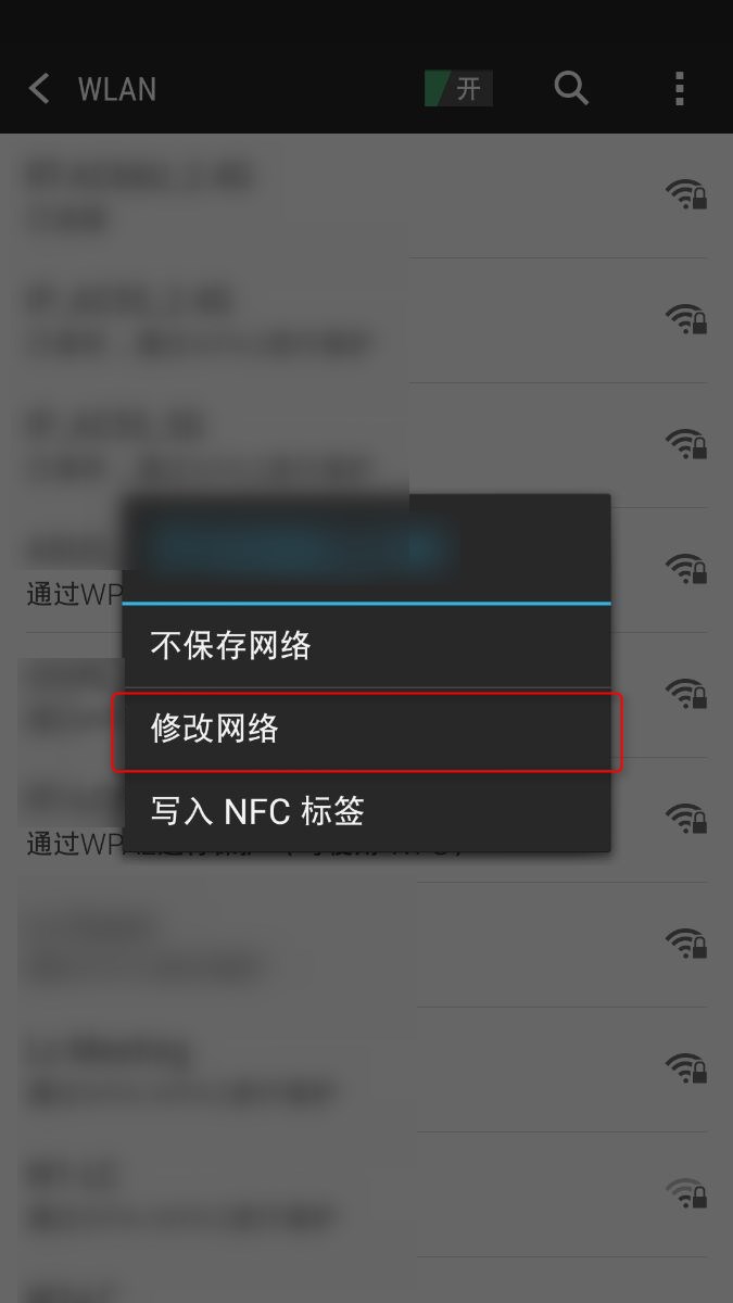 3. 在 Wi-Fi 列表选择已连接的 Wi-Fi 名称, 长按之后选择 “ 修改网络 ”